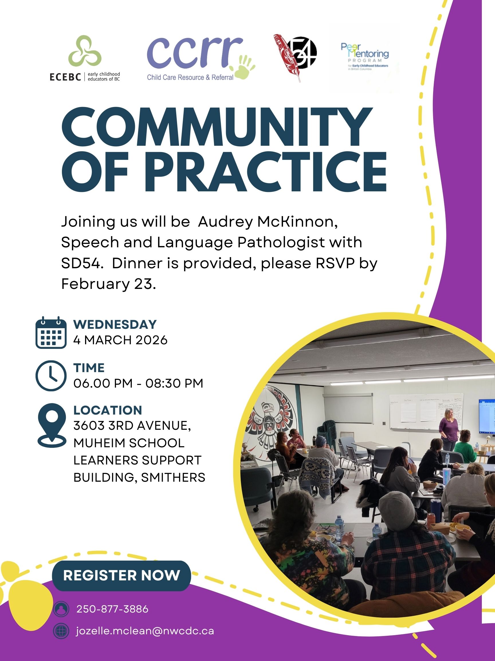 Joining us will be Audrey McKinnon, Speech and Language Pathologist with SD54. Dinner is provided, please RSVP with Jozie McLean, 250-877-3886 or jozelle.mclean@nwcdc.ca