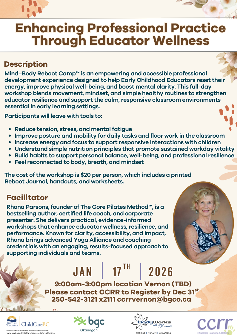 Mind–Body Reboot Camp™ is an empowering and accessible professional development experience designed to help Early Childhood Educators reset their energy, improve physical well-being, and boost mental clarity. This full-day workshop blends movement, mindset, and simple healthy routines to strengthen educator resilience and support the calm, responsive classroom environments essential in early learning settings.