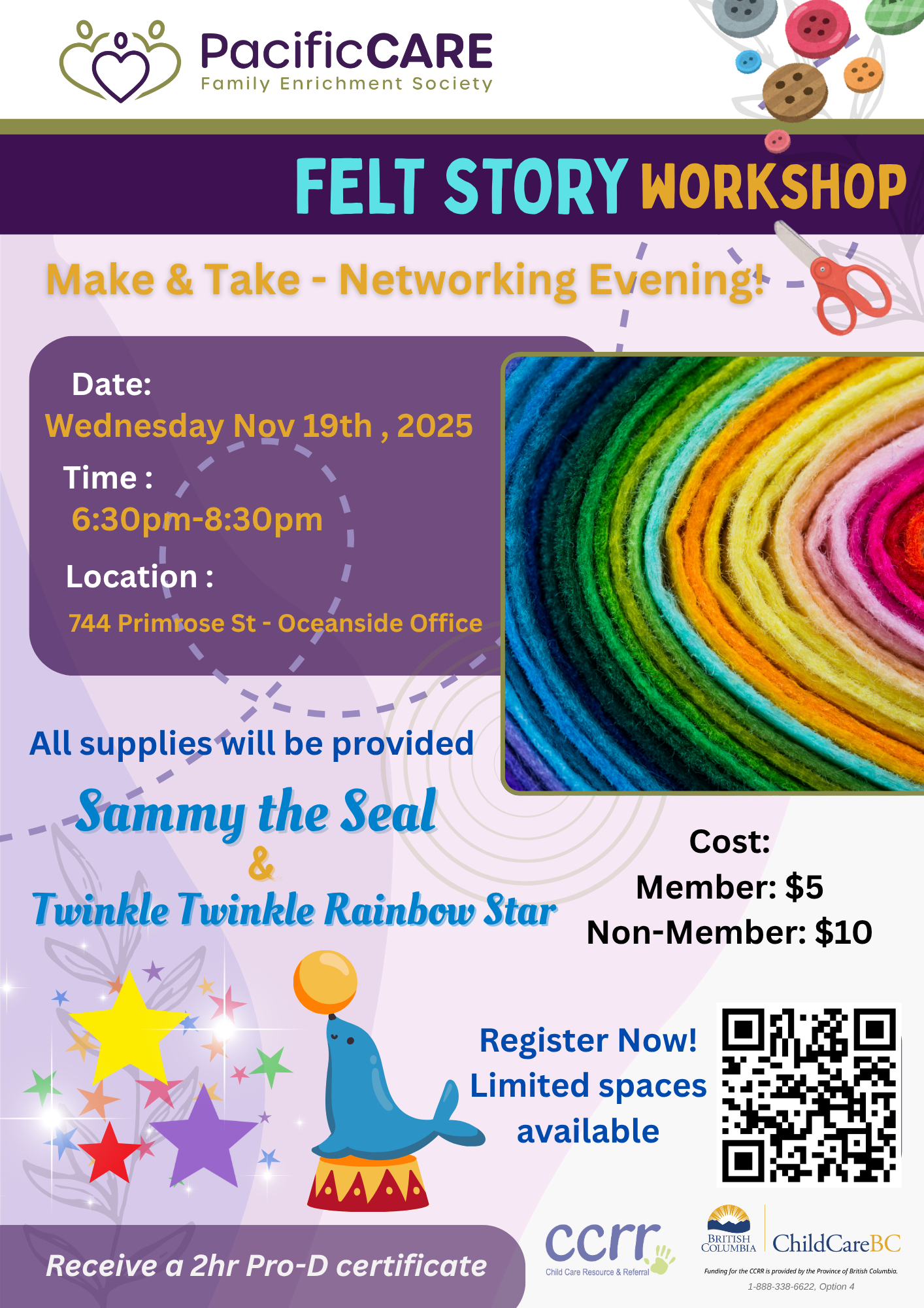Home Events - Early Years BC Curriculum/Program Development In Person Felt Story Workshop November 2025 Date Nov 19 2025 Time 6:30 pm - 8:30 pm Labels In Person Felt Story Workshop November 2025 Make and take networking night Share this event X + Add to Google Calendar + iCal / Outlook export 00 days 00 hours 00 minutes 00 seconds