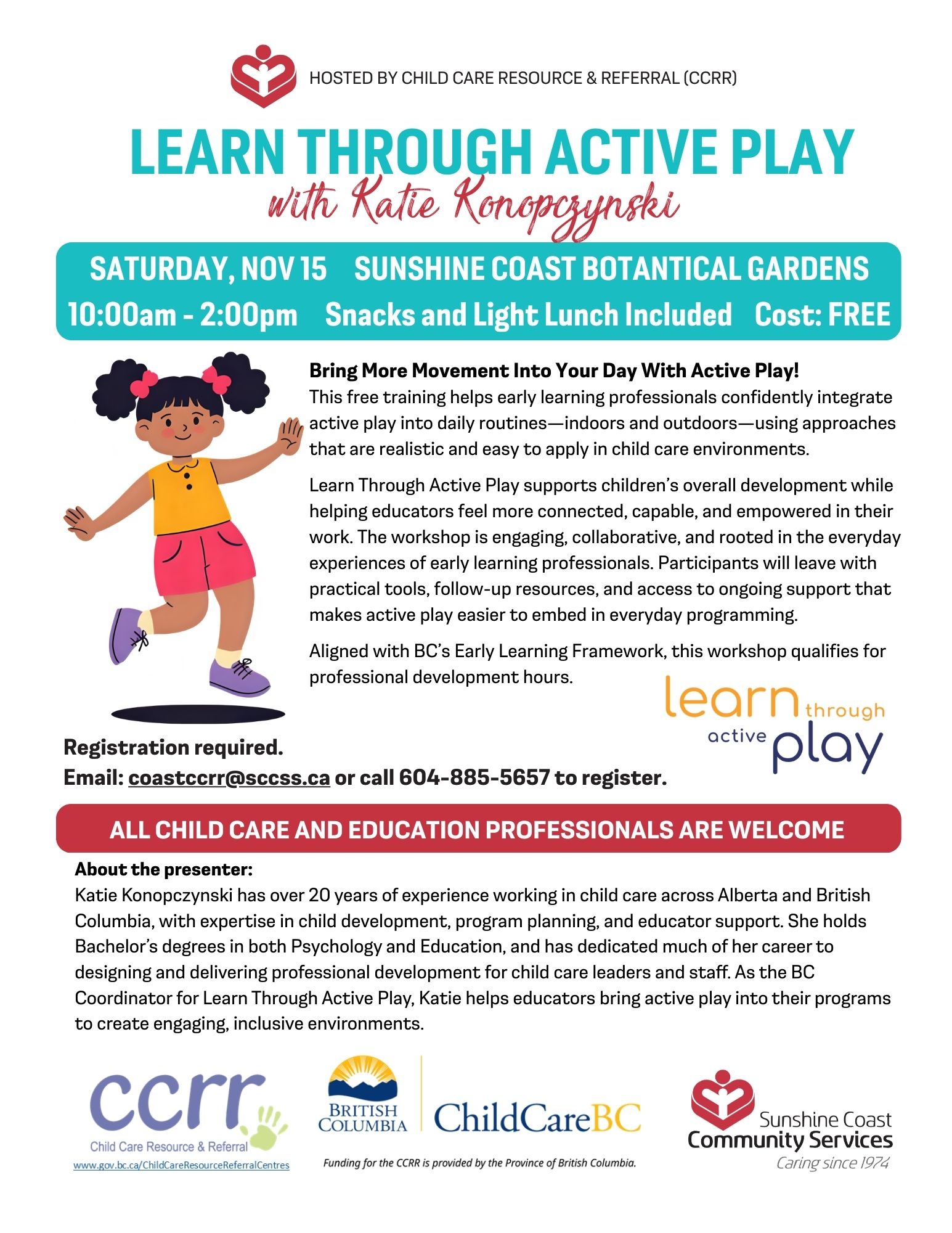 This free IN-PERSON training helps early learning professionals confidently integrate active play into daily routines—indoors and outdoors—using approaches that are realistic and easy to apply in child care environments. Learn Through Active Play supports children’s overall development while helping educators feel more connected, capable, and empowered in their work. The workshop is engaging, collaborative, and rooted in the everyday experiences of early learning professionals. Participants will leave with practical tools, follow-up resources, and access to ongoing support that makes active play easier to embed in everyday programming.