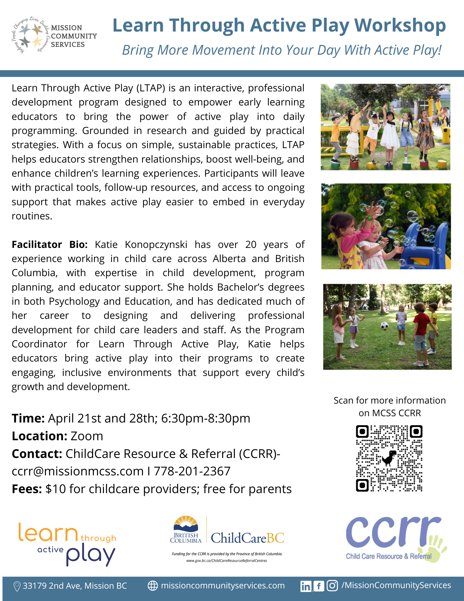 Bring More Movement Into Your Day With Active Play! Learn Through Active Play supports children’s overall development while helping educators feel more connected, capable, and empowered in their work. The workshop is engaging, collaborative, and rooted in the everyday experiences of early learning professionals. Participants will leave with practical tools, follow-up resources, and access to ongoing support that makes active play easier to embed in everyday programming.