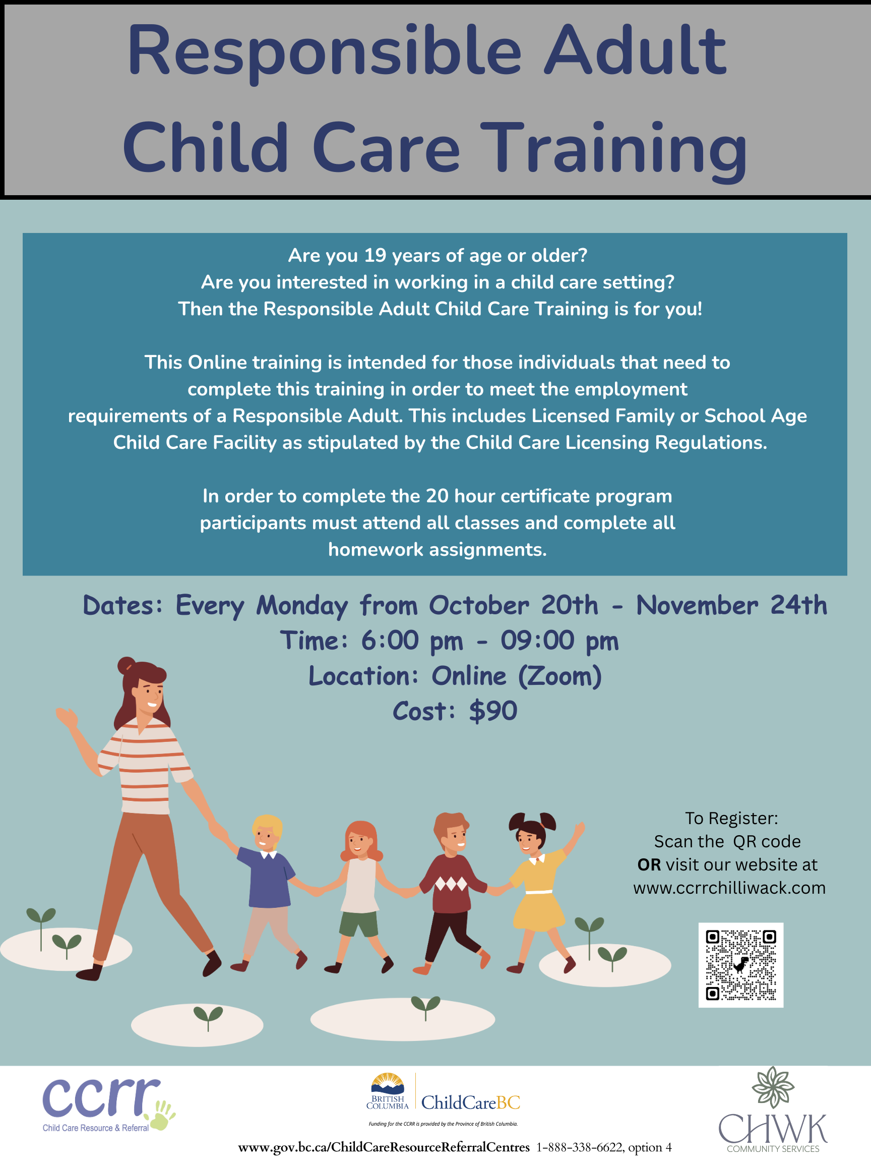 If you are 19 years of age or older and are interested in working in a childcare setting, then the Responsible Adult Child Care Training is for you! This training is intended for those individuals that need to complete the 20 hours of training in order to meet the employment requirements of a Responsible Adult. This includes Licensed Family or School Age Child Care Facility as stipulated by the Child Care Licensing Regulations.