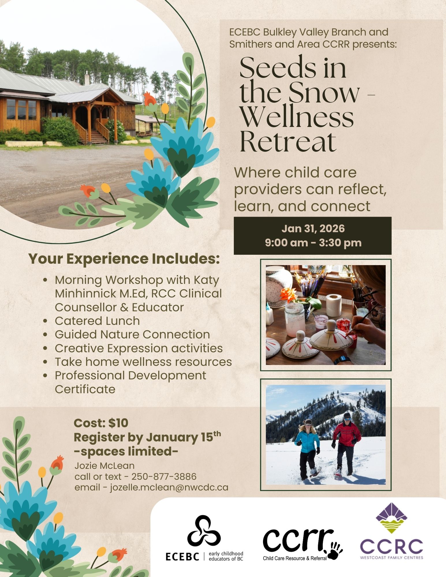 ECEBC Bulkley Valley Branch and Smithers and Area CCRR presents: Seeds in the Snow Wellness Retreat. Where child care providers can reflect, learn, and connect. It will take place at Round Lake Hall in Telkwa on Jan 31, 2026 from 9:00am to 3:30pm. There will be a workshop in the morning with Katy Minhinnick M.Ed, lunch provided onsite, activities and reflections in the afternoon. Cost is $10, registration required. Spaces are limited, registration deadline has been extended to Jan 21st, or until spaces are filled. Call or text Jozie 250-877-3886 or email jozelle.mclean@nwcdc.ca to register.