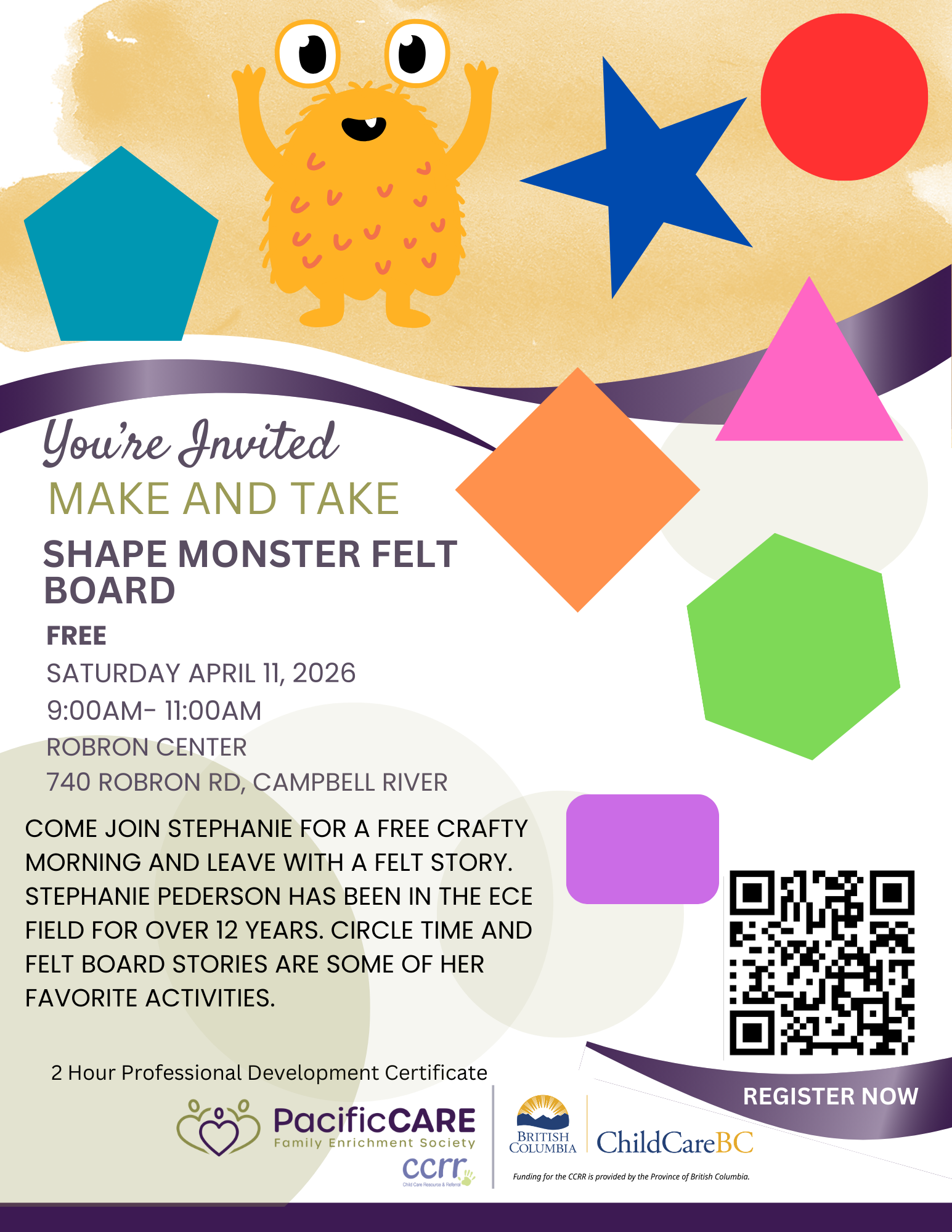 Come join Stephanie for a free crafty morning and leave with a felt story. Stephanie Pederson has been in the ECE field for over 12 years. Circle time and felt board stories are some of her favorite activities.