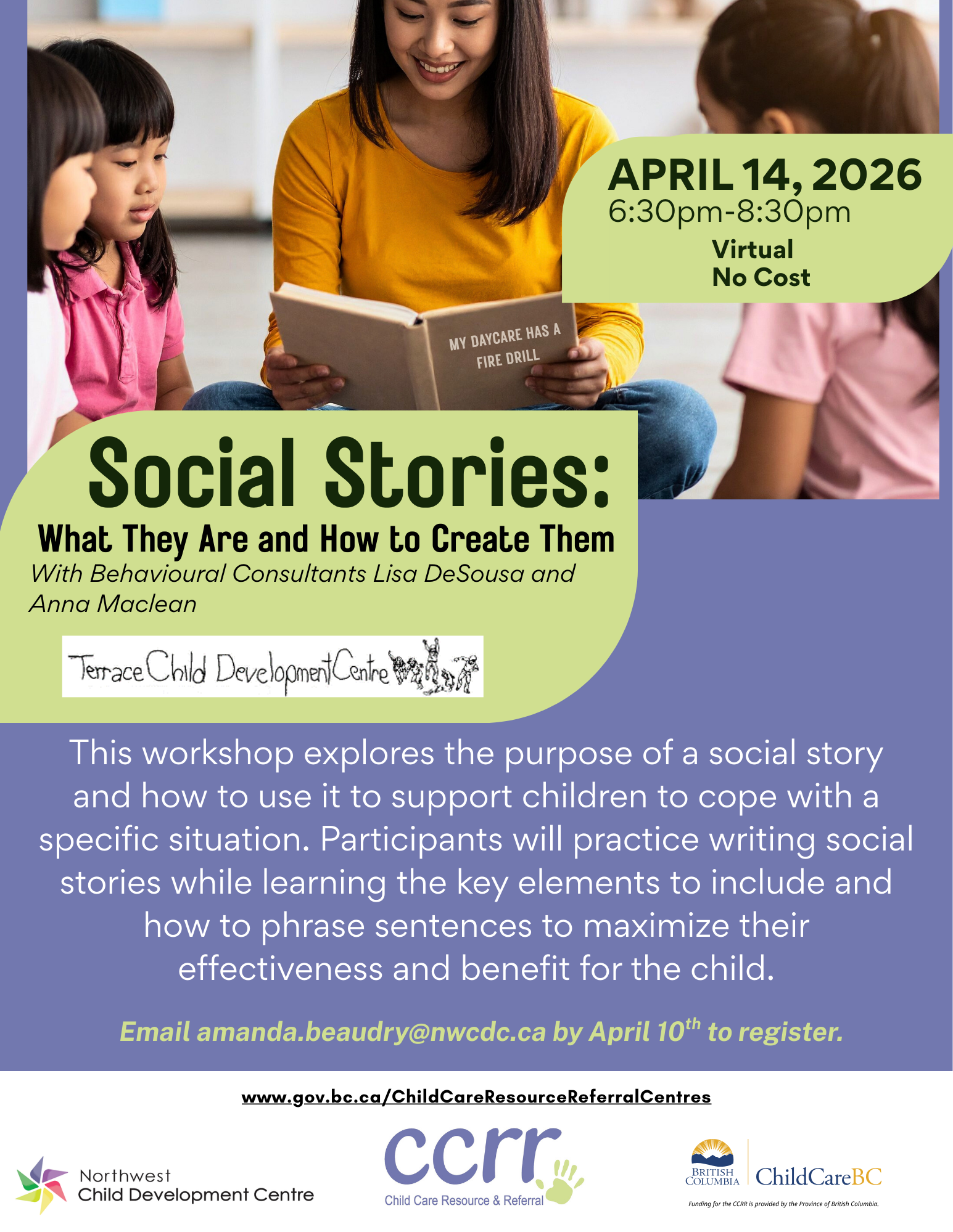 Home Events - Early Years BC Inclusive Child Care Online Social Stories Date Apr 14 2026 Time 6:30 pm - 8:30 pm Labels Online Social Stories Please see poster for information Contact email: amanda.beaudry@nwcdc.ca Contact tel: 2506415635 Share this event X + Add to Google Calendar + iCal / Outlook export 00 days 00 hours 00 minutes 00 seconds