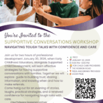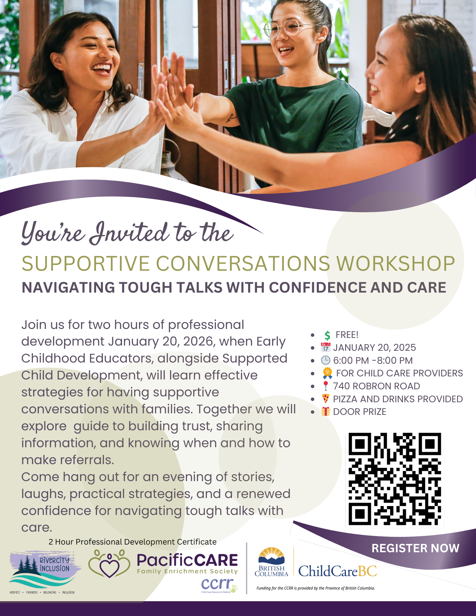 Navigating Tough Talks with Confidence and Care. Join us for two hours of professional development January 20, 2026, when Early Childhood Educators, alongside Supported Child Development, will learn effective strategies for having supportive conversations with families. Together we will explore guide to building trust, sharing information, and knowing when and how to make referrals. Come hang out for an evening of stories, laughs, practical strategies, and a renewed confidence for navigating tough talks with care.