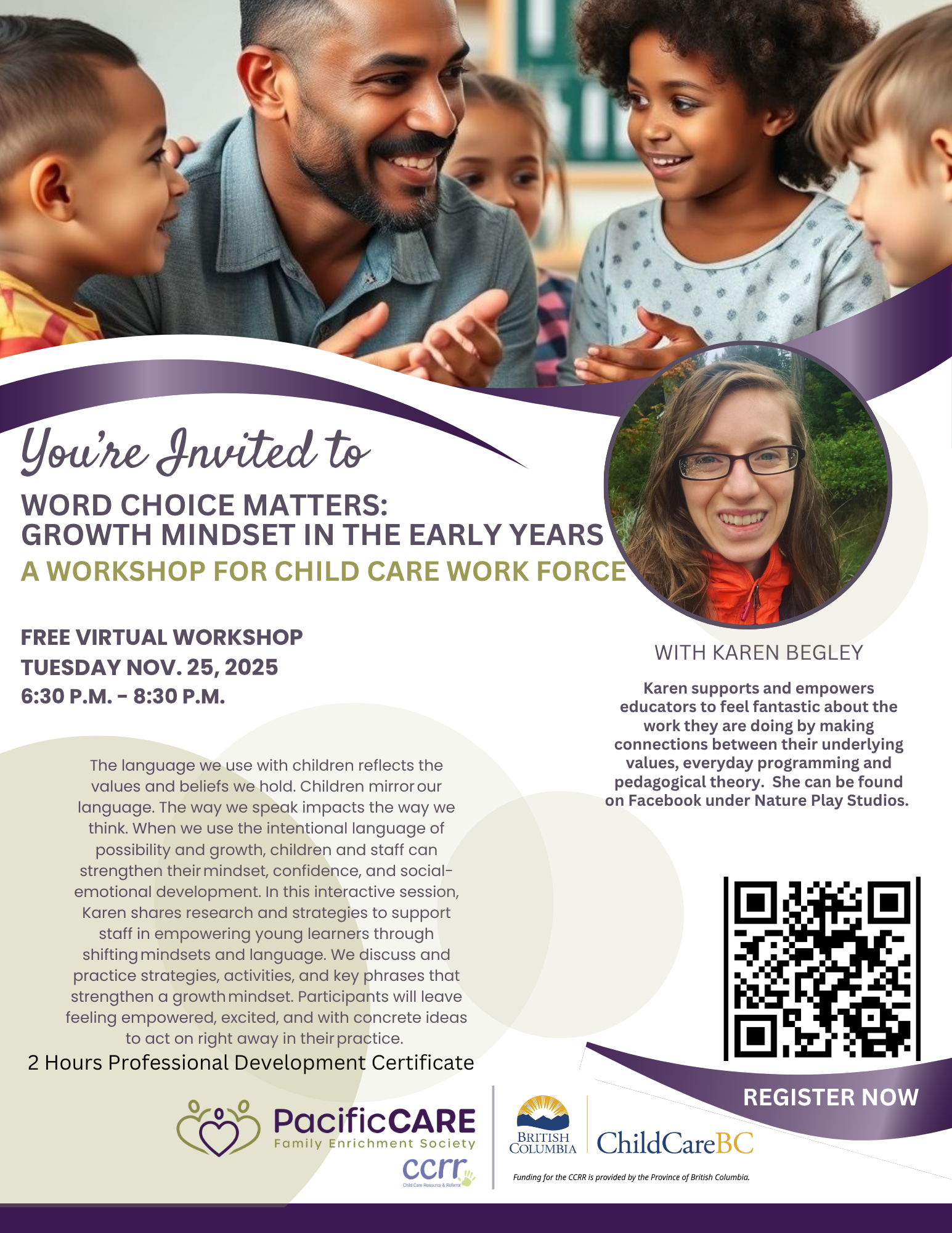 During the workshop we will discuss and practice strategies, activities and key phrases that strengthen a growth mindset around the knowledge that language we use with children matters.